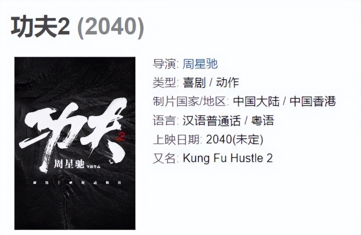 但不巧的是,好多年过去了,关于此片却还没有任何消息。而更让人难以理解的是,在国内的电影平台上,显示《功夫2》的上映时间竟然是2040年。