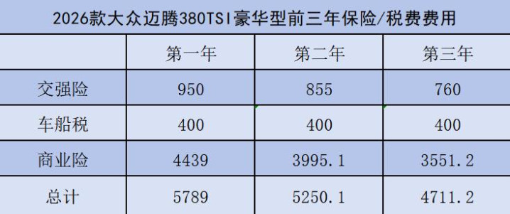 总的来说,如果购买大众迈腾380TSI车型后,商业险仅缴纳第三者责任险和车辆损失险,那么首年总保费为5789元,不出险的情况下,费用会有所下调,前三年总计费用为15750元。