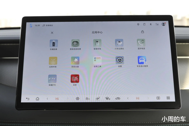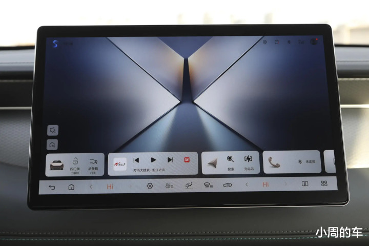 车机的UI界面被分为了上中下三块儿,最下方是固定的Dock栏,集成了空调调节、设置键、菜单栏、分屏以及HOME键等常用功能;中间位置是可以自定义设置的小组件,在这里可以添加车辆状态、蓝牙电话、导航等功能;根据日常的使用习惯,上方位置则是用来添加常用的导航、音乐等软件,其界面被做了放大处理,整体遵循了常用/重要功能零层级直达的原则。