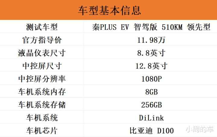 本次我们测试的车型是比亚迪秦PLUS EV的2025款 智驾版 510KM 领先型,该车配备8.8英寸液晶仪表以及12.8英寸悬浮式中控屏(低配版本为10.1英寸),屏幕的分辨率为1080P,其内置了比亚迪DiLink智能操作系统,车机芯片也是来自比亚迪自家的D100型号。