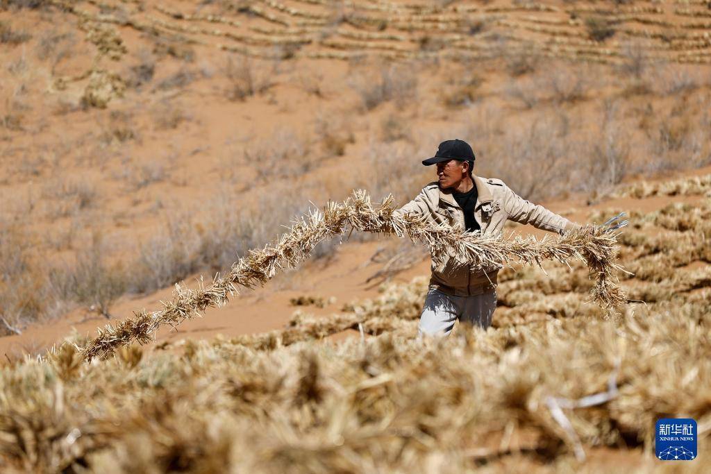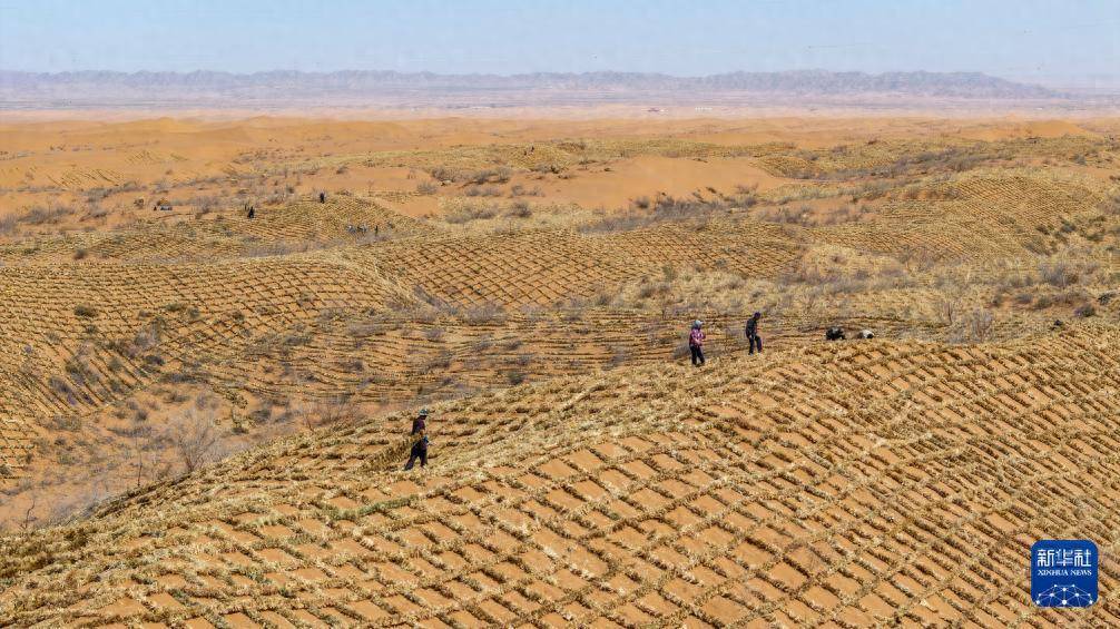 近日,宁夏中卫市组织治沙工人开展春季宁夏境内腾格里沙漠固沙锁边带改造提升工作,铺设新式草方格沙障,不断巩固治沙成果,筑牢黄河上游生态屏障。